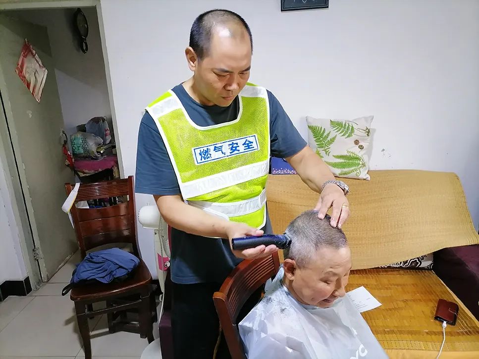 藍焰老兵服務(wù)隊分為兩組,分別到社區(qū)徐鴻林和池玉英老人家中。志愿隊員們與老人親切聊天,詢問老人的生活起居,了解老人日常生活需求,幫助老人打掃衛(wèi)生、整理家務(wù)、安檢燃氣設(shè)施,為徐鴻林老人理發(fā)。通過為老人提供親情陪護服務(wù),讓老人孤獨的心靈得到慰藉,享受到家庭般的溫暖,一下子就拉進了彼此的距離。兩位老人家非常感謝“藍焰老兵”服務(wù)隊的關(guān)愛,臨行前,依依不舍拉住志愿者的手說,“你們以后一定還要常來呦!”