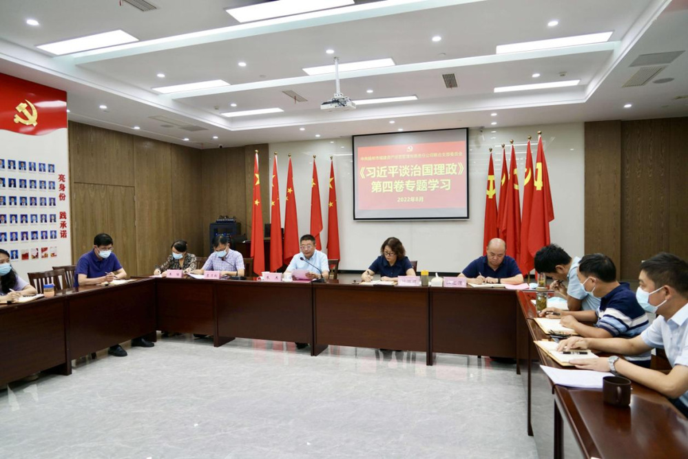 為進一步學懂弄通做實習近平新時代中國特色社會主義思想,推動黨的創(chuàng)新理論在全公司上下落地見效,8月31日,資產(chǎn)公司聯(lián)合黨支部召開支委班子理論學習組(擴大)學習會議,專題學習《習近平談治國理政》第四卷。公司聯(lián)合黨支部支委班子成員參加學習會議,并結合各自分管工作和學習情況作主題交流發(fā)言。黨小組組長和各部門、物業(yè)公司負責人列席學習會議。