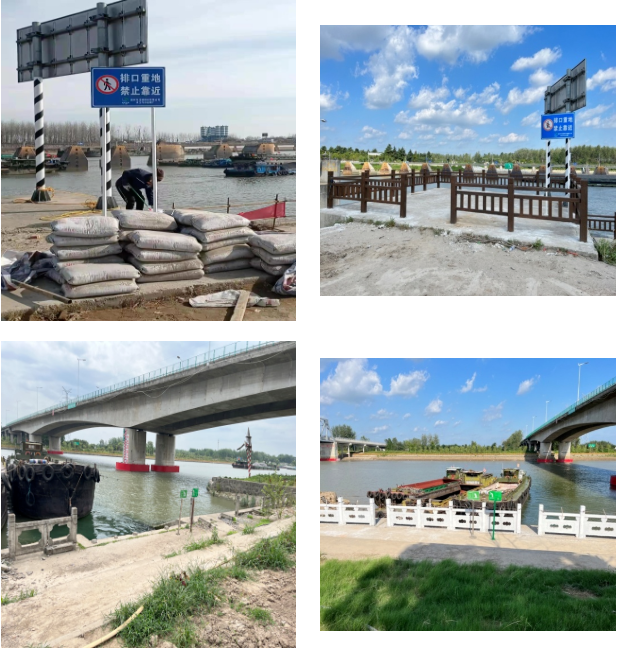 揚州市湯汪污水處理廠、六圩污水處理廠尾水排放口位于京杭大運河施橋閘附近,常常成為貨運船只停泊之地,排放口的安全防護設(shè)施與安全警示標識因此遭到損壞。