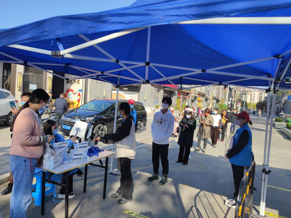 10月24日,在吾悅樸墅東門核酸檢測(cè)服務(wù)點(diǎn),“e飛揚(yáng)”志愿服務(wù)隊(duì)志愿者正在協(xié)助專業(yè)人員進(jìn)行信息登記、秩序維護(hù)、采樣咨詢服務(wù),這是服務(wù)隊(duì)兩周來第3次助力社區(qū)核酸檢測(cè)。