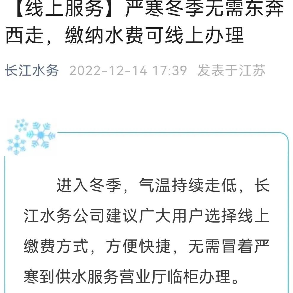 長江水務(wù)公司積極推廣線上“云服務(wù)”,通過微信公眾號(hào)、企業(yè)微信平臺(tái)等宣傳渠道,倡議廣大用戶在辦理涉水業(yè)務(wù)時(shí)“非必要不臨柜”,可通過支付寶、微信、“我的揚(yáng)州”APP、網(wǎng)銀等多種方式,進(jìn)行繳費(fèi)或查詢業(yè)務(wù)。“水務(wù)微管家”通過企業(yè)微信為用戶提供繳費(fèi)清單和電子發(fā)票,向用戶推送防凍保溫提醒、停水預(yù)告、水質(zhì)報(bào)告等服務(wù)資訊。讓用戶“足不出戶”就能辦理業(yè)務(wù)、掌握信息,同時(shí)及時(shí)受理并解決用戶反映的用水問題,做到“事事有回復(fù),件件能落實(shí)”。