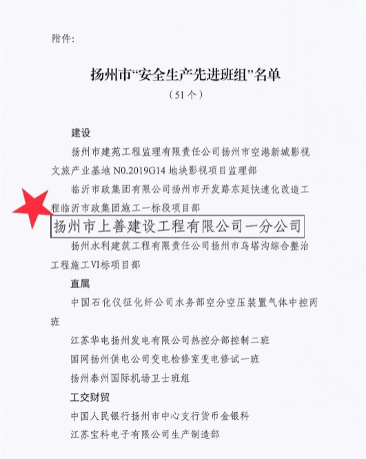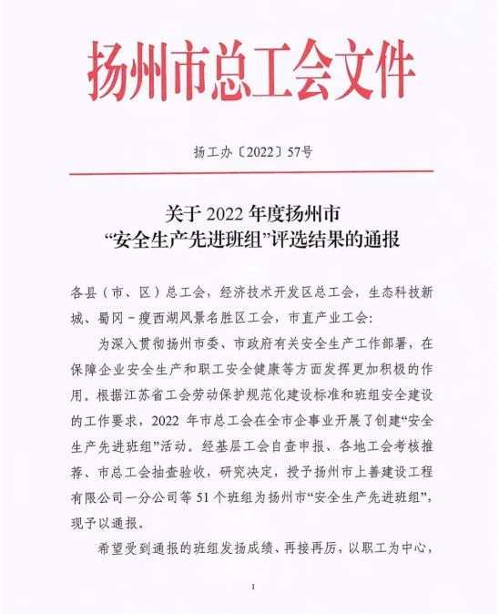 上善公司深入貫徹?fù)P州市委、市政府、城控集團(tuán)有關(guān)安全生產(chǎn)工作部署,在保障企業(yè)安全生產(chǎn)和職工安全健康等方面發(fā)揮積極作用。近日,市總工會(huì)發(fā)文表彰了2022年度市“安全生產(chǎn)先進(jìn)班組”,上善公司一分公司在此次評(píng)選中脫穎而出,被授予該項(xiàng)榮譽(yù)稱號(hào)。