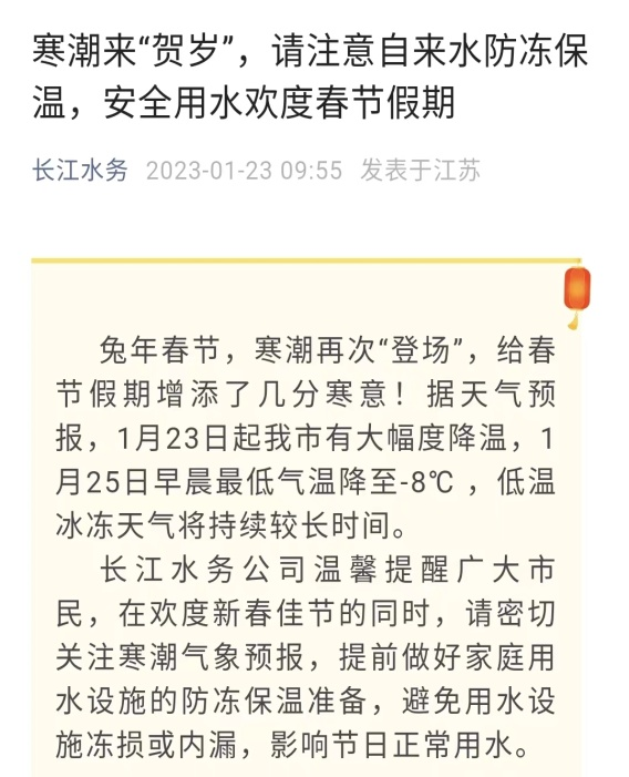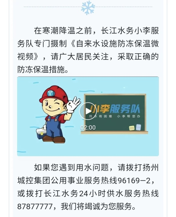 兔年春節(jié)假期我市遭遇持續(xù)寒潮天氣,有嚴(yán)重冰凍,為保證市民用戶正常用水,長(zhǎng)江水務(wù)一方面通過(guò)媒體、微信公眾號(hào)等平臺(tái)密集發(fā)布寒潮預(yù)警,提前宣傳水表水管防凍保溫方法,另一方面由抄表員在各社區(qū)群、業(yè)主群里發(fā)送防凍提醒,特別提醒離揚(yáng)的市民在出門前關(guān)閥排空防凍,做好防凍保溫準(zhǔn)備。長(zhǎng)江水務(wù)“小李服務(wù)隊(duì)”加強(qiáng)春節(jié)值班值守,奔赴各居民小區(qū),積極為居民提供維修服務(wù)。