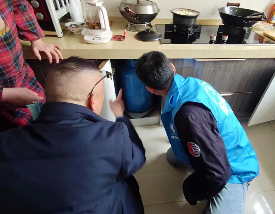 此次活動(dòng)設(shè)在新橋華庭別墅(莊臺(tái))區(qū),群眾最擔(dān)心就是家中是否符合安裝條件。藍(lán)焰衛(wèi)士分批上門進(jìn)行查勘。在居民佘女士家中,其現(xiàn)在使用的集成灶進(jìn)氣處與天然氣入戶管道相反,且安裝位置受限,藍(lán)焰衛(wèi)士們?nèi)翰呷毫?,共同為佘女士提供?yōu)化解決方案。