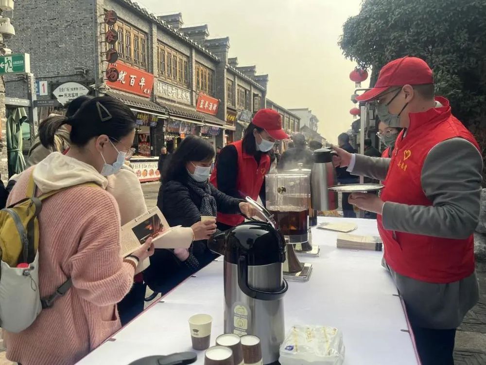 長樂客棧酒店門前,志愿者們擺放好便攜式保溫壺、桌面飲水機(jī)等用具,為往來的市民及游客提供愛心茶水等服務(wù)。一杯杯滿是溫情的熱茶,茶煙裊裊,唇齒留香,不僅解渴,更是暖心,來往行人都可以自行取飲,讓溫暖陪伴他們同行。