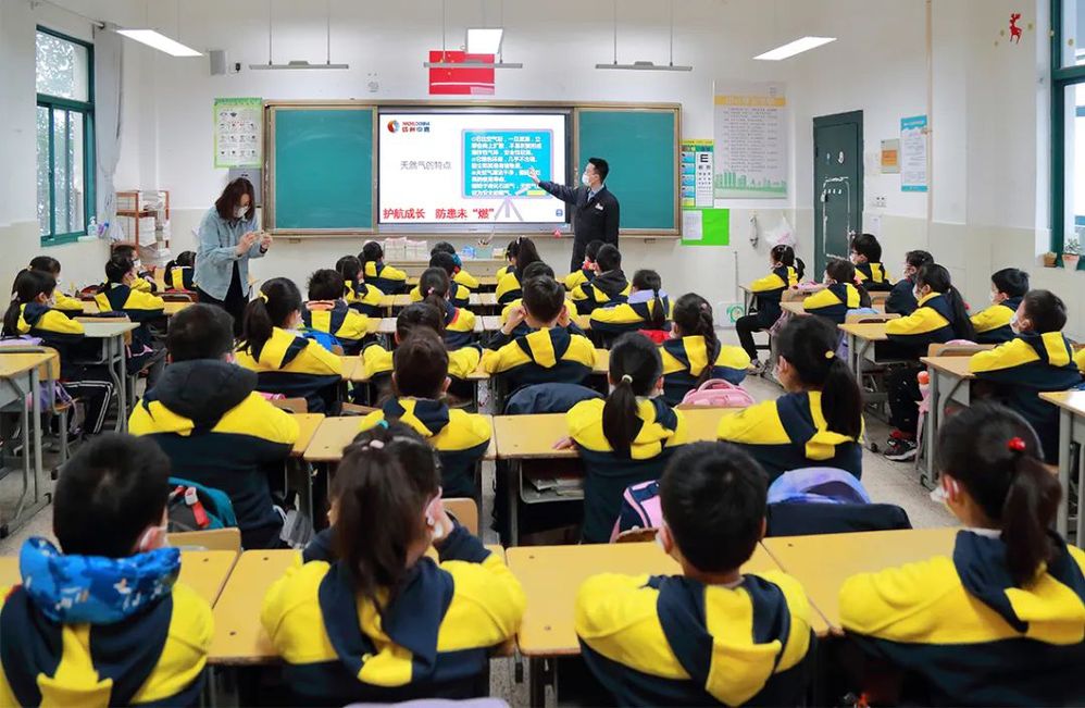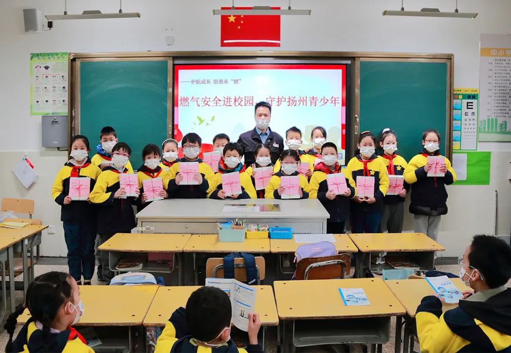 “同學們,你們知道什么是天然氣嗎?你們知道如何使用天然氣嗎?”在梅嶺小學三年級一班,揚州中燃“藍焰”志愿者為同學們送上燃氣安全宣教“第一課”。