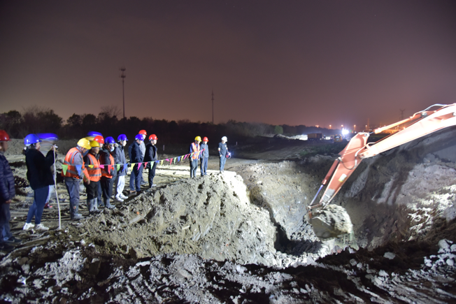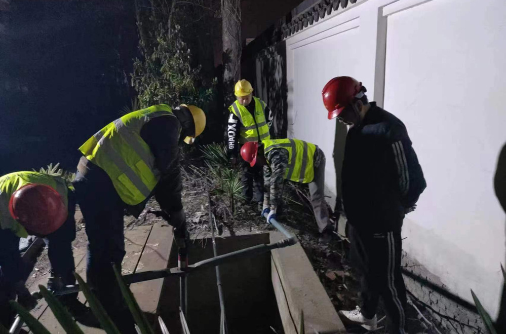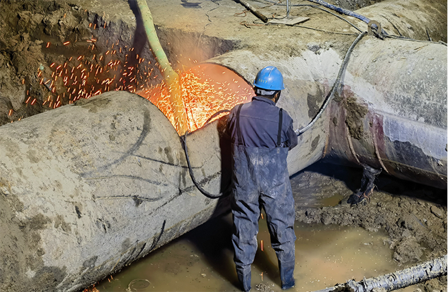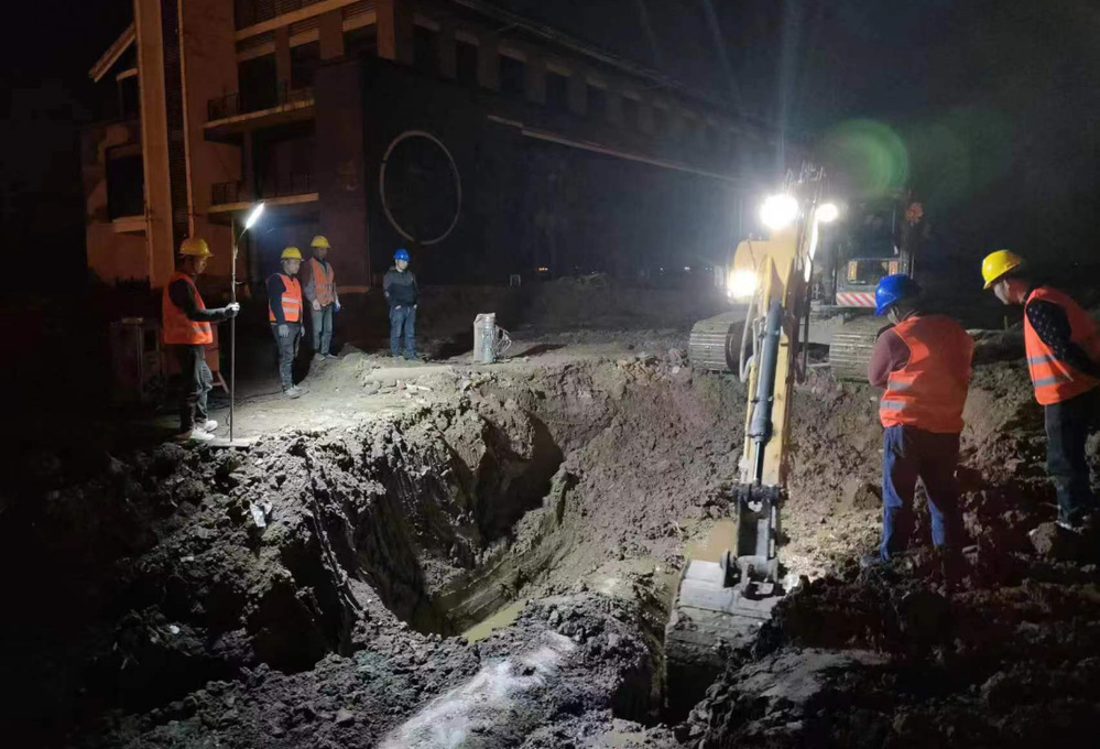 公司領(lǐng)導(dǎo)在施工現(xiàn)場(chǎng)靠前指揮,潤(rùn)元公司、搶維修中心施工人員提前進(jìn)場(chǎng),采用挖掘機(jī)等大型機(jī)械打開作業(yè)坑,及時(shí)開挖好管道溝槽,備好管件材料,并做好管道改移的其他各項(xiàng)準(zhǔn)備。28日晚8點(diǎn),閘門關(guān)閉,經(jīng)過4小時(shí)泄壓、排水后,4處碰接點(diǎn)同時(shí)作業(yè)。挖掘機(jī)的轟鳴聲此起彼伏,施工人員有序地忙碌著,陽春三月乍暖還寒,施工人員不顧寒冷刺骨的水流迅速進(jìn)入作業(yè)坑中,對(duì)舊管道進(jìn)行切割,隨后打通新設(shè)鋪管道并焊接悶板,此時(shí)已是深夜,施工人員為了盡早恢復(fù)供水,他們挑燈夜戰(zhàn)、攻堅(jiān)克難、爭(zhēng)分奪秒,始終以飽滿的工作熱情堅(jiān)守在施工一線。