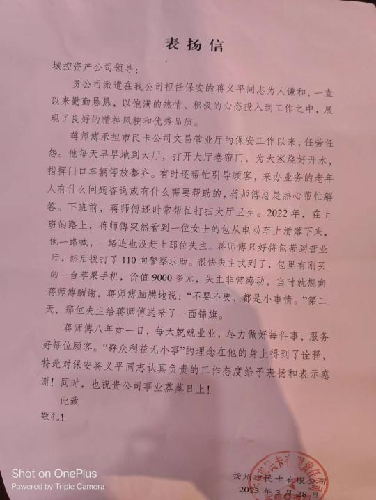 近日,資產(chǎn)公司收到了一封表揚(yáng)信,表揚(yáng)在市民卡營業(yè)廳服務(wù)的城建物業(yè)公司保安蔣義平。