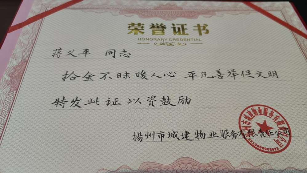 8年間,他多次拾金不昧,包括有一次他在上班途中撿到一位女士掉落的手提包,通過警察找到失主李女士后才得知包內(nèi)有一臺(tái)價(jià)值9000多元的新手機(jī),失而復(fù)得的李女士非常激動(dòng),特地隔日再次來到營業(yè)廳,向蔣師傅贈(zèng)送了一面錦旗,感謝蔣師傅拾金不昧的義舉。