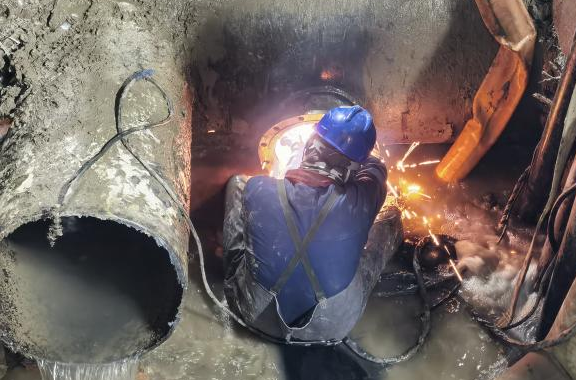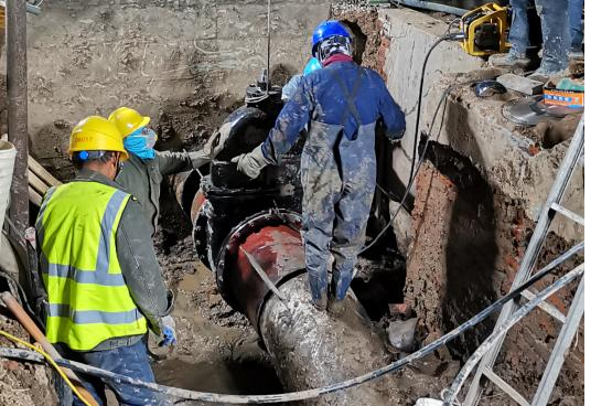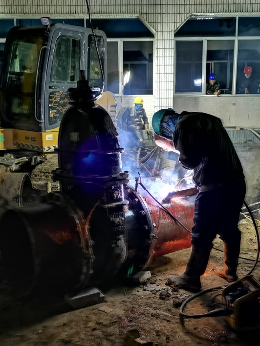 因考慮到本次更換工作作業(yè)面小,施工條件差,閥門老舊,施工時長將直接影響第四水廠自來水生產(chǎn)。4月13日上午,公司領(lǐng)導(dǎo)班子成員、施工項目部負責(zé)人查勘現(xiàn)場,完善應(yīng)急保障預(yù)案,充分做好技術(shù)交底,模排施工流程,所有人員、設(shè)備聽令待發(fā),各項準備工作均一一落實落細。下午3點,新裝閥門及管件連接、反光隔離柵欄、切割設(shè)備等均放置就位,做好管道碰接最后準備。4月13日20點,施工序幕全面拉開。關(guān)閉閥門、排水泄壓、抽排余水、安裝閥門、焊接鋼管、開啟閥門各部門協(xié)同配合,現(xiàn)場人員爭分奪秒搶奪進度。