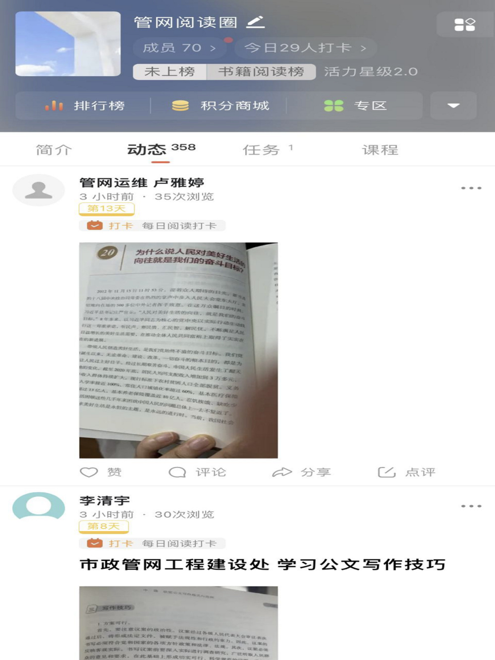 活動(dòng)開展以來,各部門積極響應(yīng),職工利用工作之余每日堅(jiān)持打卡,有的分享生產(chǎn)技術(shù)專業(yè)知識(shí),有的分享詩詞經(jīng)典,有的分享名人著作,通過積極分享發(fā)表讀書感悟,互相點(diǎn)贊鼓勵(lì),營造了“比學(xué)趕超”良好學(xué)習(xí)氛圍。