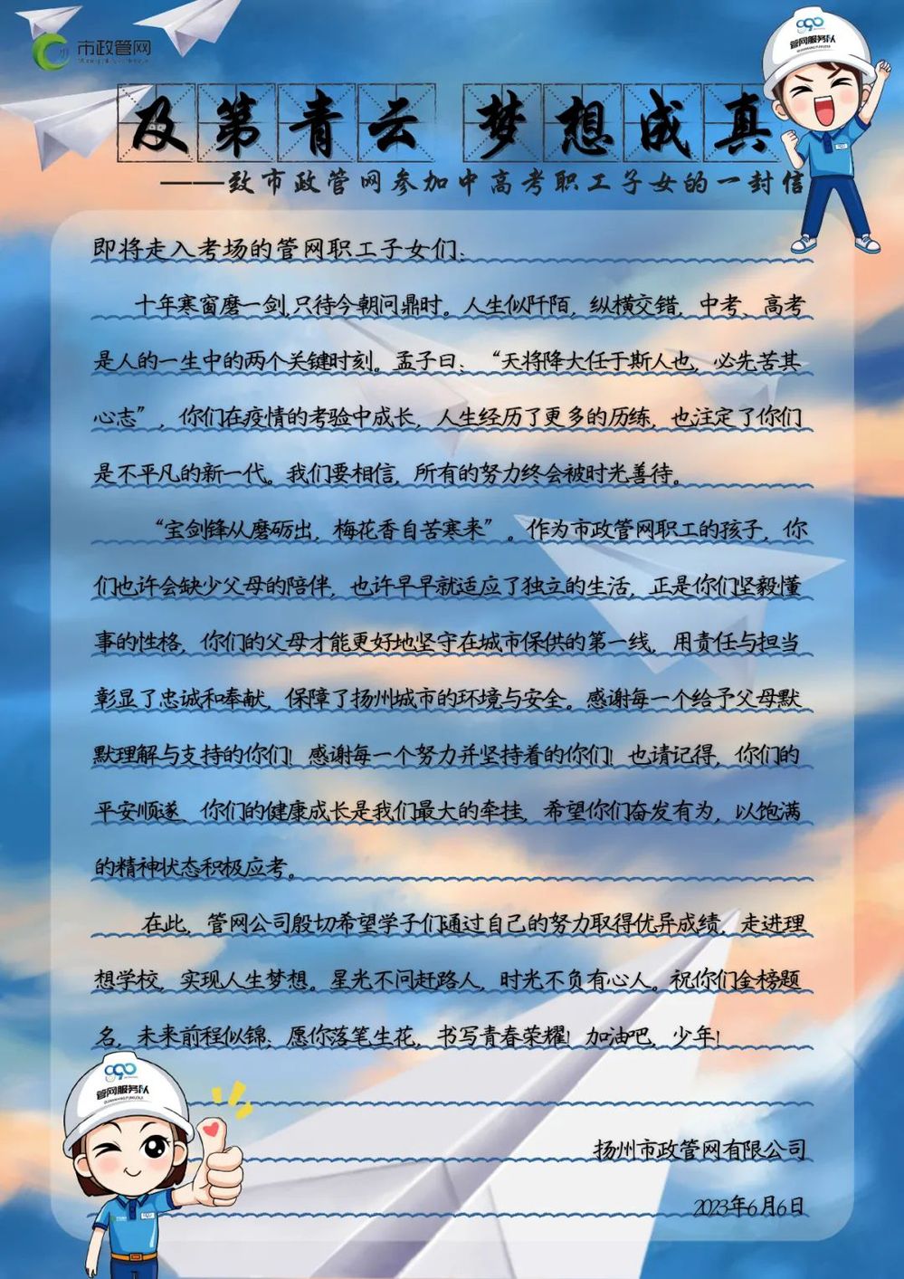 中高考是人生的重要時(shí)刻,也是每個(gè)家庭的共同期待。為了緩解考生及家長(zhǎng)的壓力,給學(xué)子送去誠摯的祝福,近日,管網(wǎng)公司為“家有考生”的4名職工送上了一份寓意“一舉糕粽”“金榜題名”的祝福禮盒和一封《致中、高考學(xué)子的慰問信》。