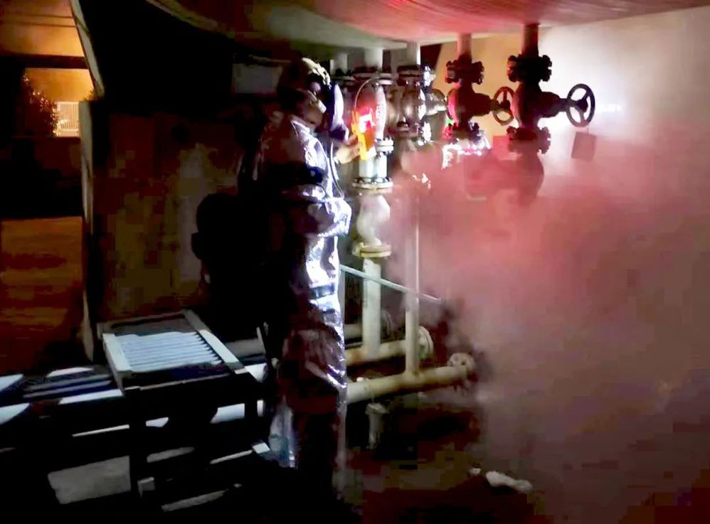 晚上9時,夜間演練正式開始?,F場巡查人員發(fā)現1#儲罐法蘭連接處突發(fā)泄漏,并報告應急指揮組,應急指揮組立即啟動應急處置預案,巡查人員用厚毛巾纏繞泄漏部位,開啟噴淋水,確保泄漏點凍結,再向罐內注水,搶修人員穿戴防護裝備、攜帶搶修設備進入現場,對泄漏點進行搶修。隨后對儲罐進行倒罐作業(yè),在該儲罐壓力低于0.05MPa后,放散結束后,再進行搶修作業(yè)。