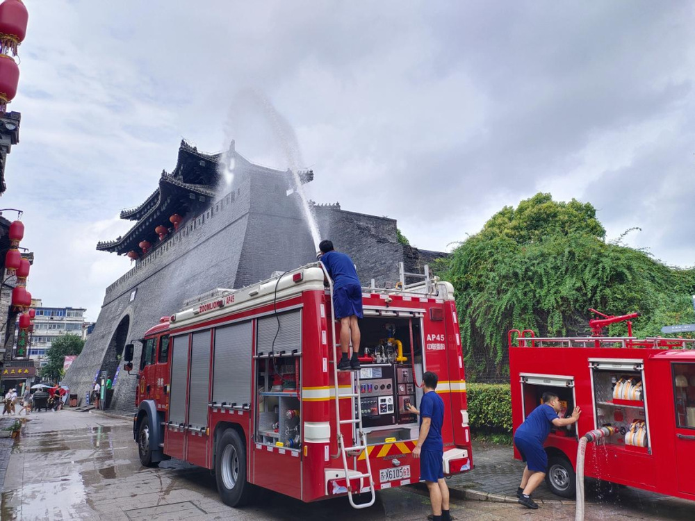 此次演習從實戰(zhàn)的角度出發(fā),測算水帶干線的鋪設距離、水槍陣地設置、力量部署、車輛的位置??康刃畔?。演練前,消防員與安保人員再次逐一對消防通道、室外消火栓布局、水源分布、電源位置等情況查看。隨后,消防員模擬街區(qū)最高點城門樓重檐頂部起火,根據前期制定的滅火救援方案從多角度、多位置對“著火點”進行滅火救援。