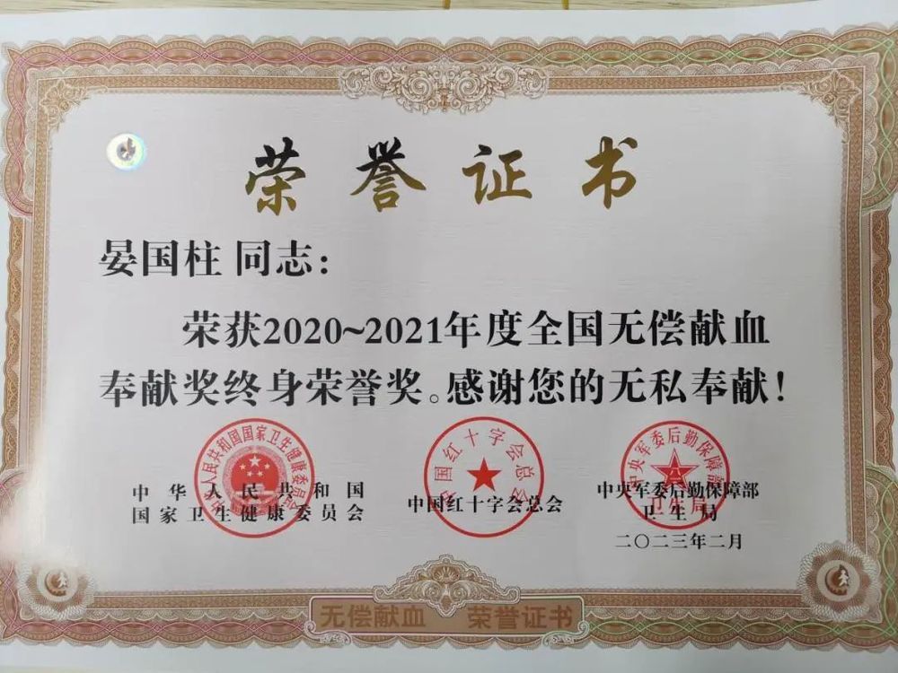 點滴熱血,“輸”寫大愛。日前,供熱公司“暖揚”服務(wù)隊隊長晏國柱同志被國家衛(wèi)生健康委、中國紅十字總會、中央軍委后勤保障部衛(wèi)生局聯(lián)合授予“無償獻血奉獻獎終身榮譽獎”。