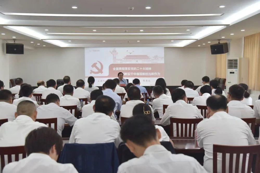 張思忠以《全面貫徹黨的二十大精神 在創(chuàng)新實干中展現(xiàn)新?lián)斝伦鳛椤窞轭},從“為何黨員干部必須要有擔當、衡量黨員干部敢于擔當?shù)臉藴省⒂脤嶋H行動詮釋‘擔當’”三個方面進行了闡述,他結(jié)合長江水務實際,既分析了問題,又提出了要求,為長江水務下一步發(fā)展指明了方向。