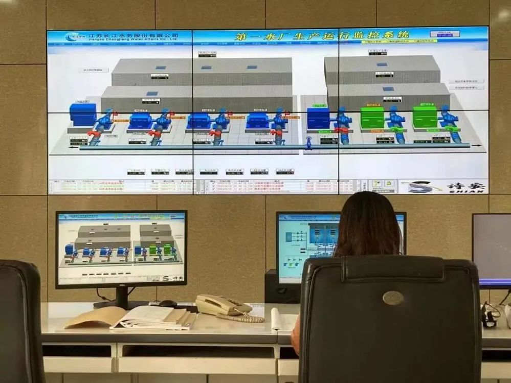 第一水廠中控室值班員在監(jiān)測機組數(shù)據(jù)