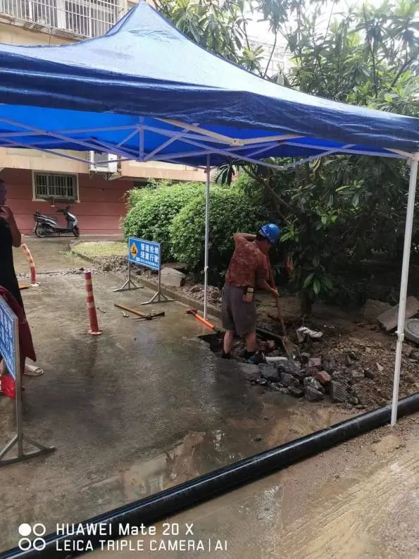 供水搶修人員頂風(fēng)冒雨搶修管道