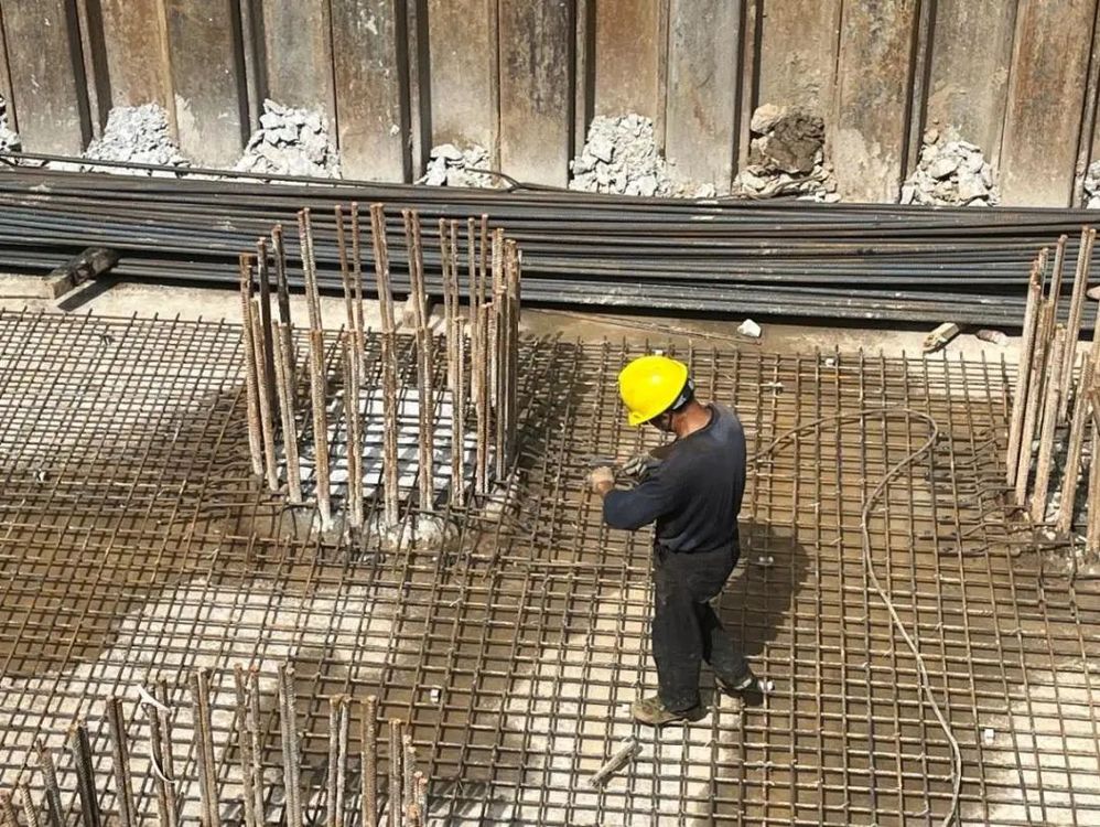 現(xiàn)場管理人員正在檢查鋼筋綁扎情況