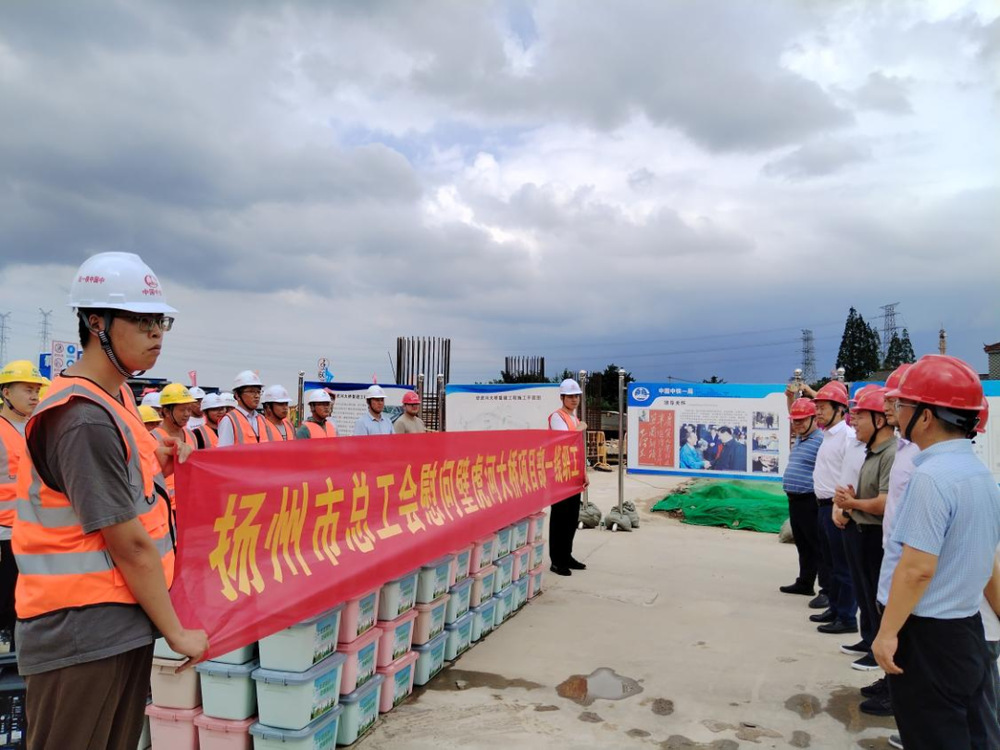 8月1日下午,揚州市總工會副主席楊浩帶隊到壁虎河大橋項目部,走訪慰問高溫下堅守一線的施工人員。城控集團副總經(jīng)理季紅軍參加了活動。