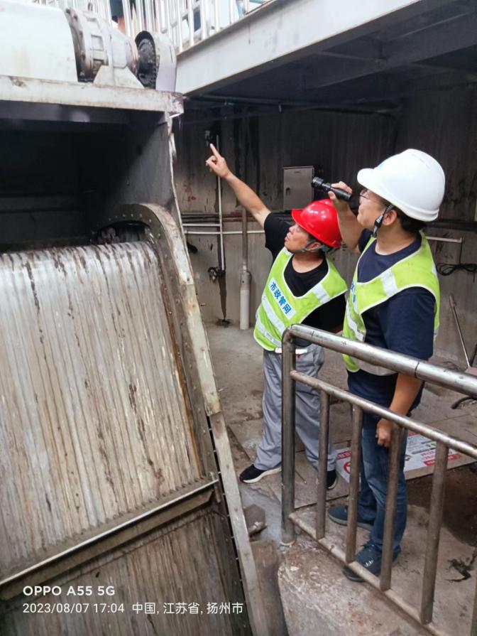 為確保污水正常輸送,避免漫溢,泵站設(shè)備維修主任陳遲第一時間趕往現(xiàn)場組織搶修。將木方取出,維修鏈條,時間一分一秒過去,泵站里環(huán)境嘈雜悶熱,氣味也大,外面氣溫本來就高,加上里面機組的機器運行產(chǎn)生的熱量,感覺像蒸桑拿一樣。室內(nèi)溫度已接近40攝氏度,陳遲的衣服很快就被汗水打濕了。