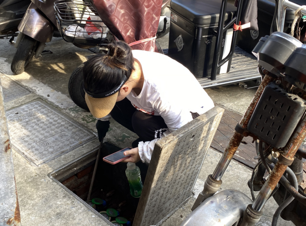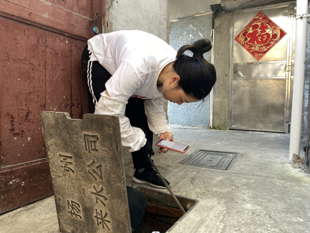 臨近中午,頭頂烈日,水表箱的重量對(duì)于身材嬌小的蔣姝雯來(lái)說(shuō),徒手拎起來(lái)很是吃力,于是長(zhǎng)鐵鉤成了她抄表時(shí)的“好搭檔”,勾起井蓋、對(duì)照表盤(pán),完成讀數(shù)回錄后,她又重新用鐵鉤將井蓋蓋好。整個(gè)過(guò)程,就見(jiàn)她彎腰、蹲下、起身,再?gòu)澭⒃倨鹕?,反反?fù)復(fù),汗水很快濕透她的衣服。一只水表抄完后,她又沿路前行,查看下一個(gè)水井表。
