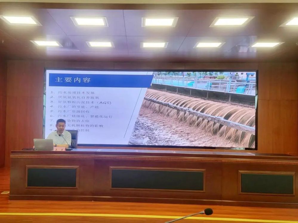 培訓(xùn)邀請(qǐng)了揚(yáng)州大學(xué)環(huán)境科學(xué)與工程學(xué)院副院長(zhǎng)、教授吳軍進(jìn)行授課。吳教授從厭氧氨氧化自養(yǎng)脫氮、好氧顆粒污泥技術(shù) (AGS)、污水廠的節(jié)能, 產(chǎn)能、污水廠資源回收、污水廠精細(xì)化,智能化運(yùn)行、新污染物的去除、進(jìn)水無(wú)機(jī)顆粒物的影響和溢流污染的控制等多個(gè)方面對(duì)污水處理技術(shù)進(jìn)行了生動(dòng)講解,并為技術(shù)人員答疑解惑,現(xiàn)場(chǎng)研學(xué)氛圍濃厚。