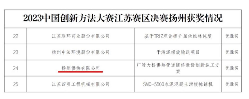 近日,供熱公司勞模創(chuàng)新團(tuán)隊(duì)申報(bào)的《廣陵大橋供熱管道隨橋敷設(shè)創(chuàng)新施工方案》通過層層選拔入圍了由省科協(xié)、省工商聯(lián)、省國資委主辦的2023年中國創(chuàng)新方法大賽江蘇賽區(qū)總決賽,并在與全省13個(gè)設(shè)區(qū)市152個(gè)創(chuàng)新項(xiàng)目的激烈角逐中獲得優(yōu)勝獎(jiǎng)。