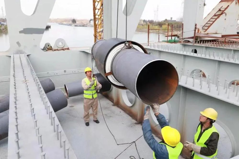 本次創(chuàng)新方案來源于市級(jí)重大項(xiàng)目揚(yáng)州市東南主干線熱網(wǎng)工程,其中廣陵大橋隨橋段是該工程的一個(gè)關(guān)鍵節(jié)點(diǎn)。橋梁總體呈弧型且橋面起拱變化大,管道軸線位于南側(cè)橋翼邊緣內(nèi)側(cè),對安裝的角度和精度的要求較高,傳統(tǒng)的吊裝方式難以滿足該項(xiàng)目施工要求。公司隨即組織勞模創(chuàng)新團(tuán)隊(duì)進(jìn)行技術(shù)攻關(guān),經(jīng)過反復(fù)的實(shí)地查看和研討磋商,并廣泛征集了工程設(shè)計(jì)單位和施工單位的意見,設(shè)計(jì)出一種“倒F”型吊架,成功解決了大重量、大管徑管道橋翼內(nèi)側(cè)吊裝的問題,有效減少了成本、縮短了工期,同時(shí)大大提高了施工的安全性和可靠性。對于類似工況下的大重量、大管徑管道隨橋敷設(shè)具有借鑒和推廣價(jià)值。