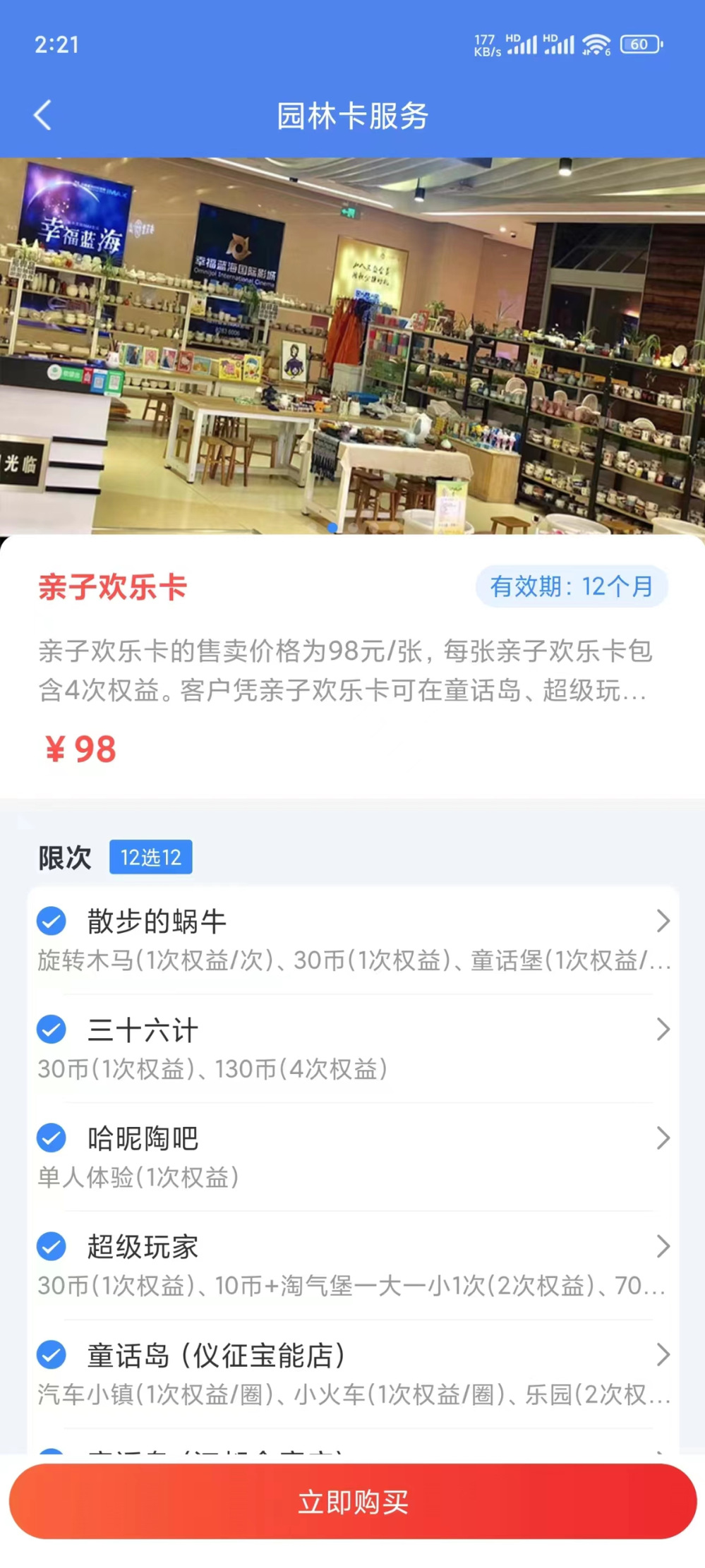 親子歡樂卡的售賣價格為98元/張,每張親子歡樂卡包含4次權(quán)益。