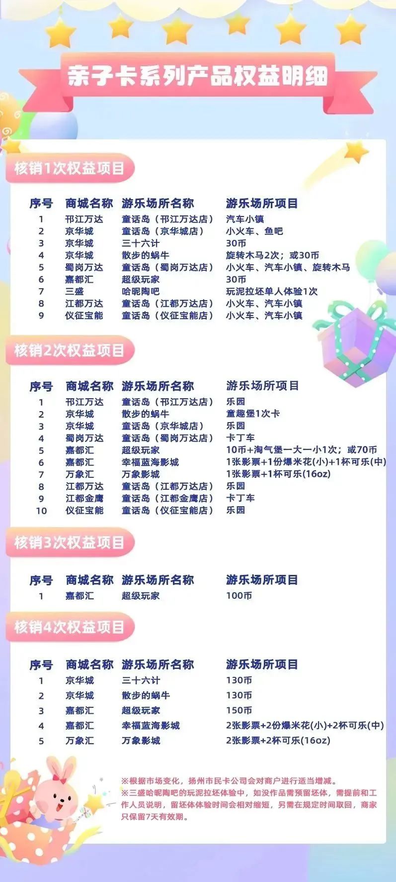 各商戶提供游玩項目,需扣除相應的權(quán)益次數(shù)。權(quán)益次數(shù)至購買日起一年內(nèi)有效。