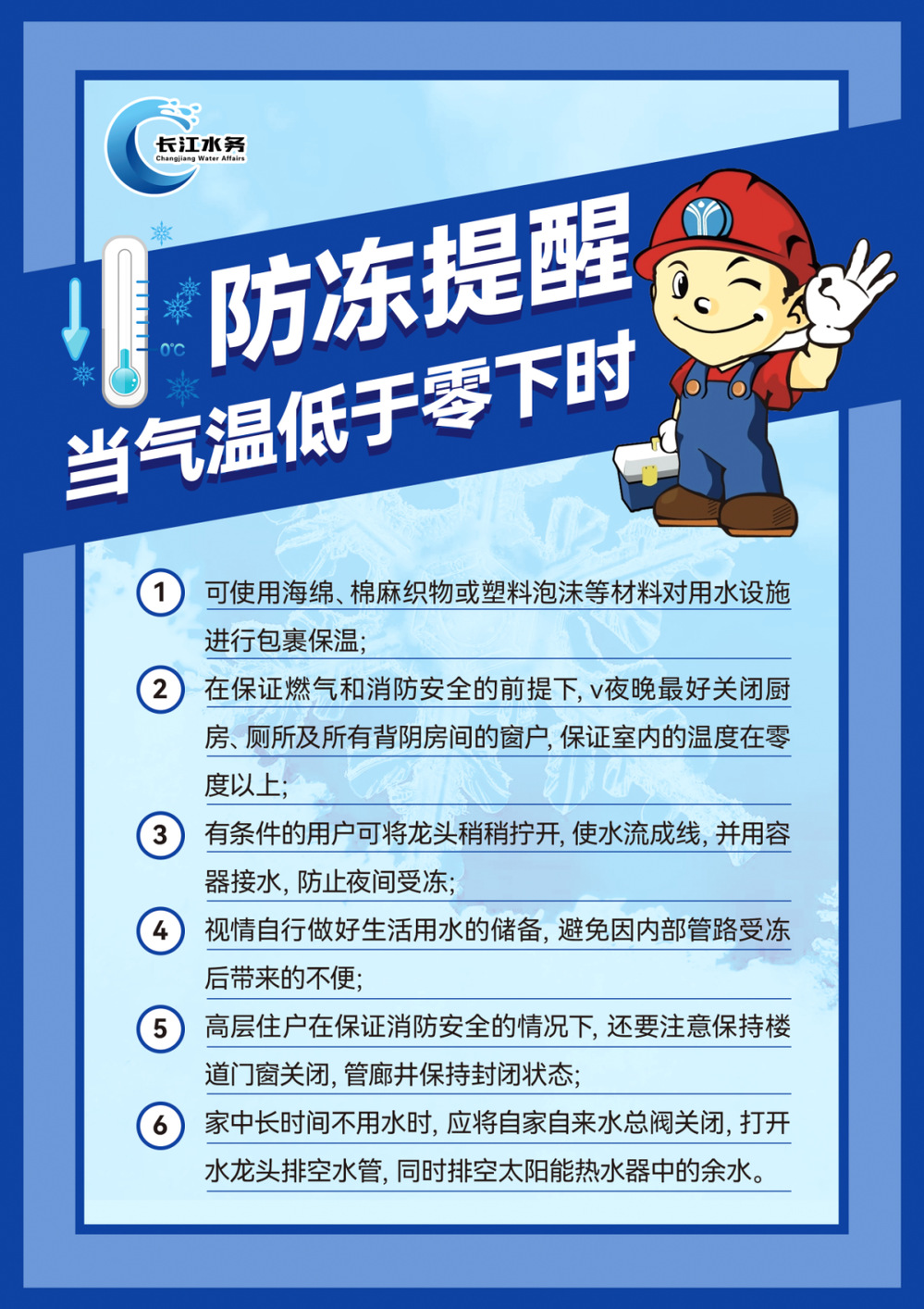 天氣預(yù)報(bào)12月中下旬我市遭遇寒潮,最低氣溫可能降至-7℃,為了滿足市民的日常生活用水需求,長(zhǎng)江水務(wù)公司提前部署防凍保溫保供工作,全力以赴筑牢水龍頭、水管、水表的“溫暖防線”。