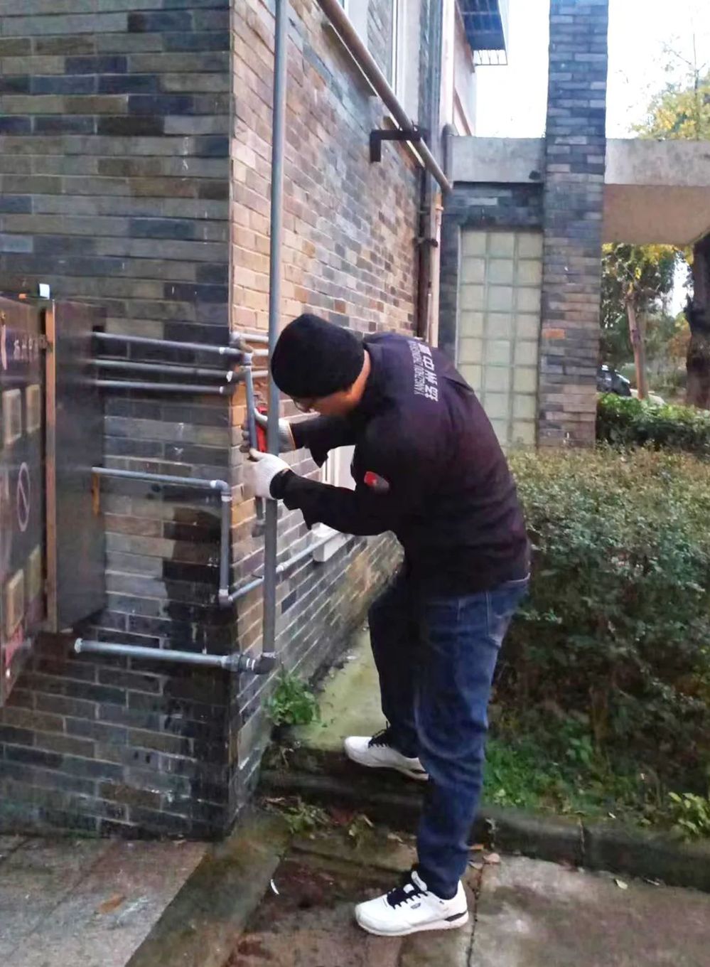 2023年12月10日,恰逢周日,當天上午,佳家花園65號樓棟居民打電話到揚州中燃公司客服熱線,報修家中燃氣無法使用。在班的客服部維修工周洋同志接到報修單后趕赴現(xiàn)場,經(jīng)反復勘查,發(fā)現(xiàn)燃氣管道進水造成無法正常供氣,遂聯(lián)系了住在佳家花園的客服維修同事韋衛(wèi)梁。“燃氣管道里面的水從哪兒來的?源頭在哪里?”,帶著這樣的疑問,兩位師傅在物業(yè)工作人員的配合下挨家挨戶排查,發(fā)現(xiàn)該樓棟402室置換的新熱水器水管接到了燃氣管內(nèi)所致,告知戶主后,隨即關閉了該戶氣閥、水閥消除安全隱患。該樓棟共四個單元計48戶業(yè)主,燃氣表全部出戶統(tǒng)一安裝于一樓表箱內(nèi)。在向客服部負責人報告后,兩位師傅結合現(xiàn)場實際情況,初步判斷行之有效的解決方案是逐一拆卸氣表和表后管道排水,沒有捷徑可行。