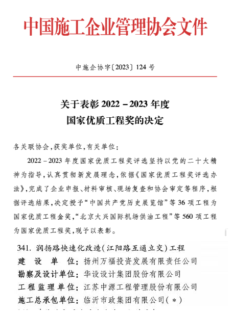 近日,中國施工企業(yè)管理協(xié)會發(fā)布《關于表彰2022-2023年度國家優(yōu)質工程獎的決定》,潤揚路快速化改造(江陽路互通立交)工程榮獲2022—2023年度第一批國家優(yōu)質工程獎。這是萬福公司繼萬福大橋工程榮獲2020-2021年度第一批國家優(yōu)質工程獎后,再一次榮獲該獎項。