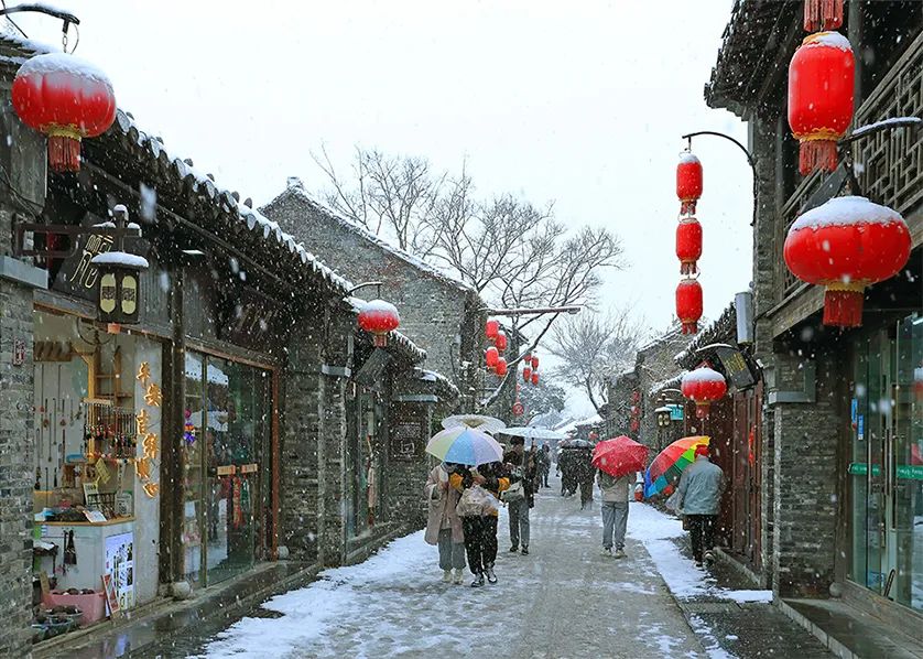 大雪賦予東關(guān)街吉祥,屋檐下的紅燈籠顯得格外耀眼。