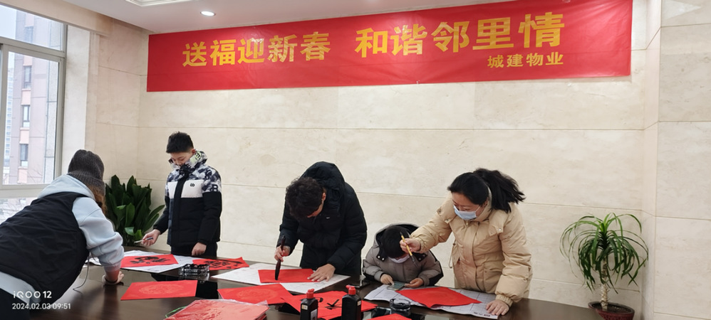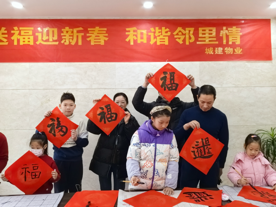 “福啟新歲,萬(wàn)事順?biāo)臁薄閼c祝新春,營(yíng)造歡樂喜慶、祥和文明的節(jié)日氛圍,讓居民群眾深切感受到傳統(tǒng)“年味”,近日,城建物業(yè)公司分別在九境融園和京杭融園小區(qū)開展了“送福迎新春,和諧鄰里情”——寫春聯(lián)送福字活動(dòng)。