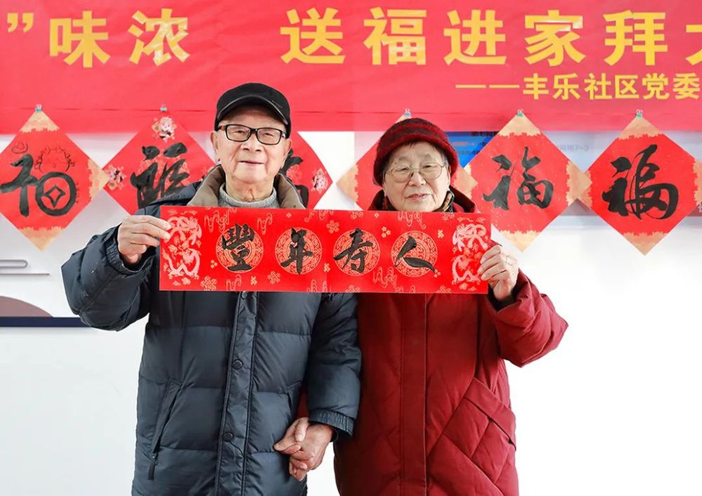 喜慶龍年好,歡歌國運昌。“印刷的‘?!趾痛郝?lián)雖然隨處都能買到,但我和老伴還是喜歡手寫的,有溫度、接地氣,每一副都是獨一無二的,福氣滿滿。祝福偉大祖國繁榮昌盛,人民幸福安康!”豐樂社區(qū)84歲高齡的居民顧正洪爺爺拿到志愿者書寫的春聯(lián)后開心地說。