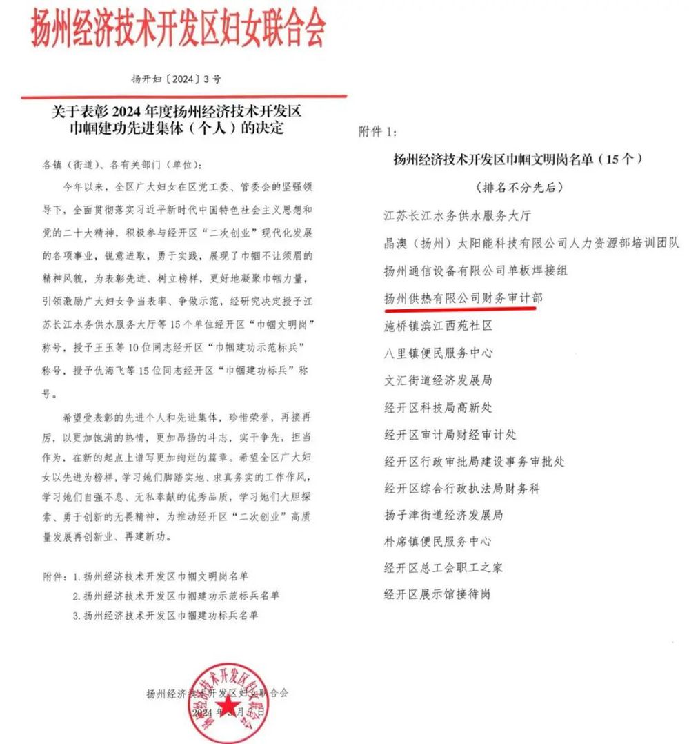 在第114個“三八”國際婦女節(jié)來臨之際,供熱公司多個女工集體和個人獲表彰,黨工部主管及紀(jì)檢監(jiān)察員張娟榮獲“江蘇省住房城鄉(xiāng)建設(shè)系統(tǒng)五一巾幗標(biāo)兵”稱號,財(cái)務(wù)審計(jì)部榮獲“揚(yáng)州經(jīng)濟(jì)技術(shù)開發(fā)區(qū)巾幗文明崗”稱號。