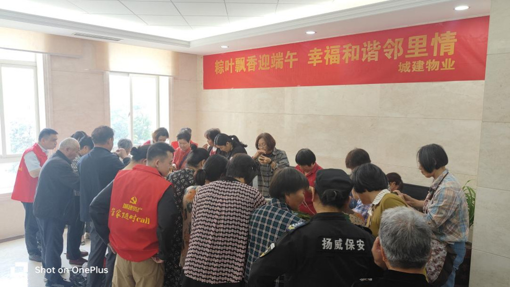 活動開始前,物業(yè)管家們早已準備好材料:粽葉、糯米、蜜棗、紅豆以及盆、桶、線、剪刀等?;顒娱_始,物業(yè)管家和小區(qū)居民一起開心包粽子,大家圍在一起說說笑笑、熱熱鬧鬧。翠綠的粽葉、雪白的糯米、赤紅的豆子、紫紅的蜜棗,像五顏六色的調色盤等著被使用,居民們你調餡我裹葉,片片粽葉被雙雙靈活的手折成漏斗狀,填充糯米壓緊實,封口后打一個結實的繩結,一個完美的粽子就這樣制作完成了。