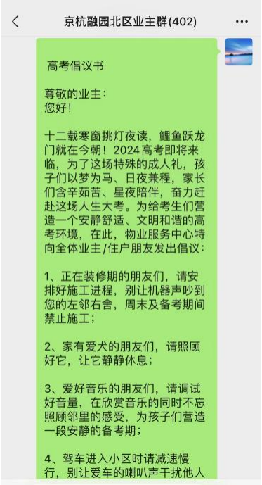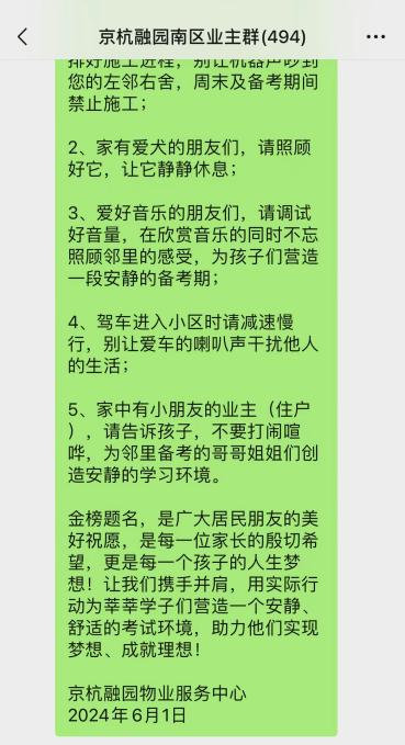 為給考生們創(chuàng)造一個(gè)良好的備考環(huán)境,物業(yè)管家通過業(yè)主群倡議以及線下宣傳的方式,廣泛倡議業(yè)主們?cè)诳忌鷤淇嫉褂?jì)時(shí)和考試期間盡量停止大聲喧嘩、車輛鳴笛、裝修等一切容易對(duì)考生造成干擾的行為。
