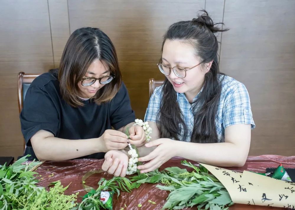 活動(dòng)現(xiàn)場(chǎng),專(zhuān)業(yè)老師細(xì)致講解了艾草葉花、茉莉花手串的操作流程和關(guān)鍵步驟等。隨即,大家化身為手工達(dá)人,按照老師的步驟和方法,一邊學(xué)習(xí)制作一邊交流經(jīng)驗(yàn),將新鮮的艾草、菖蒲、茉莉花材料,加工成一束束造型別致的艾草花束、一串串潔白清香的茉莉手串,濃濃的端午氣息撲面,大家在歡聲笑語(yǔ)中享受著儀式感滿滿的DIY樂(lè)趣。