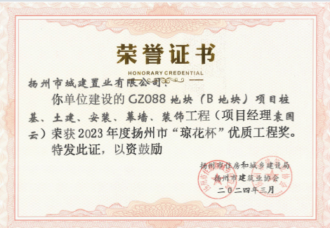 近日,揚(yáng)州市建筑業(yè)協(xié)會(huì)傳來喜訊,由置業(yè)公司開發(fā)的GZ088地塊嘉都匯項(xiàng)目榮獲“2023年度揚(yáng)州市瓊花杯優(yōu)質(zhì)工程獎(jiǎng)”。