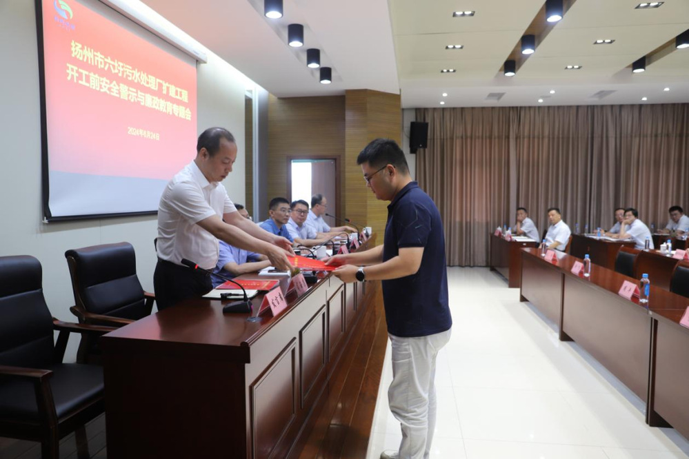 為確保六圩污水處理廠擴建工程順利開工建設(shè),做好工程建設(shè)期間的廉政工作,打造優(yōu)質(zhì)工程與廉潔工程,6月24日下午揚州潔源環(huán)境股份有限公司召開一期安全警示與廉政教育專題會。城控集團黨委副書記徐飛、副總經(jīng)理周平、企管部副部長李剛、潔源環(huán)境公司領(lǐng)導(dǎo)班子成員、駐項目安全管理人員、參建單位分管負(fù)責(zé)人和項目安全管理人員參會。