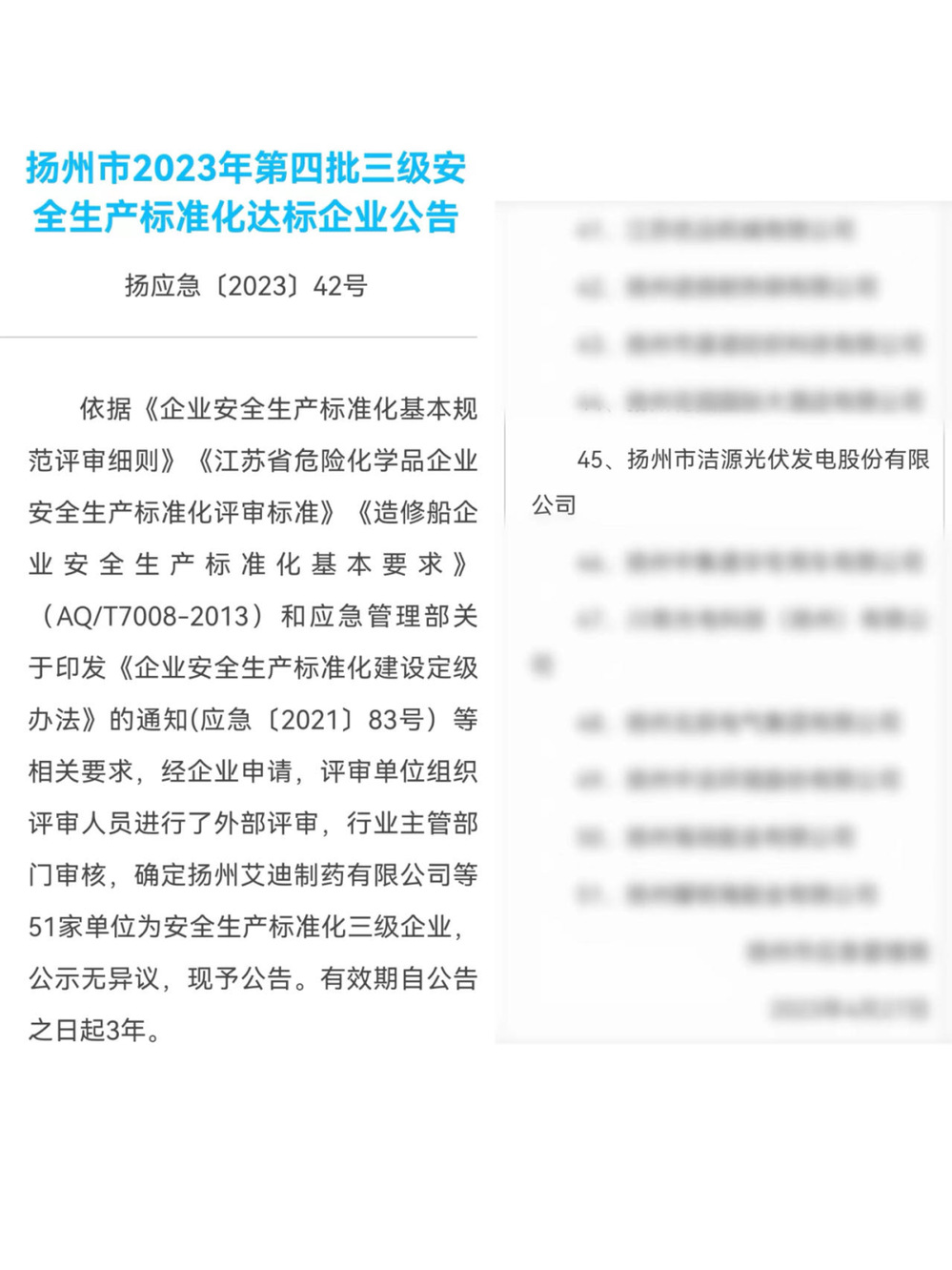 安全生產(chǎn)持續(xù)穩(wěn)定。持續(xù)強化設(shè)備檢修、高空作業(yè)、工程施工等重點部位的安全管控,細致做好光伏電站電氣設(shè)備和消防設(shè)施的隱患排查整治工作,并從安全目標管理、隱患排查治理、職業(yè)健康管理、安全培訓(xùn)和應(yīng)急管理等要素入手,全面推進安全生產(chǎn)標準化建設(shè),于2023年4月獲評揚州市三級安全生產(chǎn)標準化達標企業(yè),自成立以來未發(fā)生一起安全生產(chǎn)責任事故。