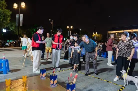 除了文化雅韻,現(xiàn)場設(shè)置了多個(gè)互動(dòng)打卡與市集體驗(yàn)區(qū),讓節(jié)日氛圍更添煙火氣?!拔以谛炷拊铝痢贝蚩c(diǎn)前,居民手持造型精巧的月亮小夜燈定格溫馨瞬間;“玉兔投壺”游戲區(qū)排起長隊(duì),老少同樂間復(fù)刻古代士人的閑情雅趣?!霸鹿馐屑眳R集文創(chuàng)手作、中秋美食等,市民憑游園卡完成互動(dòng)、集齊印章,即可兌換月亮小夜燈和冰皮月餅,將節(jié)日祝福化作觸手可及的溫暖。