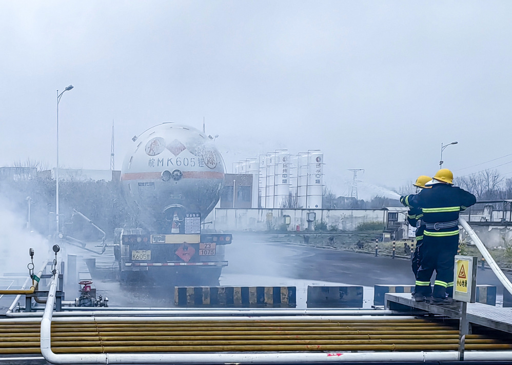 本次演練模擬液化氣槽罐車卸氣過程中突發(fā)泄漏應(yīng)急處置:卸車操作工發(fā)現(xiàn)鶴管接口泄漏后,立即通知押運(yùn)員關(guān)閉車載緊急切斷閥,卸車工關(guān)停壓縮機(jī),充裝人員同步停止作業(yè)并關(guān)閉相關(guān)閥門。安保人員迅速設(shè)置警戒線,嚴(yán)禁無關(guān)人員進(jìn)入;現(xiàn)場啟用霧狀水稀釋泄漏區(qū)域液化氣濃度,待濃度降至安全范圍后,維修人員更換損壞密封圈,并用可燃?xì)怏w檢漏儀復(fù)檢確認(rèn)無隱患,隨后恢復(fù)充裝卸車作業(yè)。