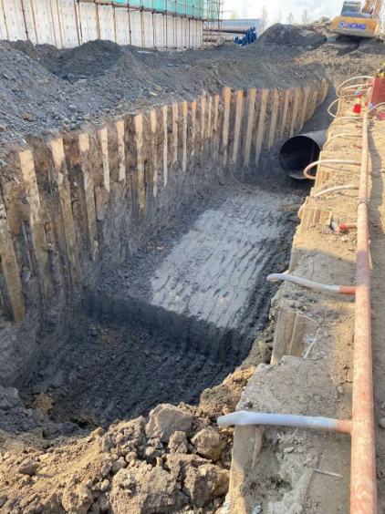 湯汪污水處理廠三期工程二沉池工藝污水進水管道施工,該管道是三期生物池至二沉池進水主干管,涉及基坑支護、基坑降水、土方開挖及起重吊裝工程,屬于重要分部分項工程。該工藝污水管長達54米,管徑為1.8米,項目推進過程中,各參建方高度重視、深入現(xiàn)場,有針對的制定了專項施工方案和安全技術(shù)措施,做到責(zé)任到人,確保施工質(zhì)量和安全。