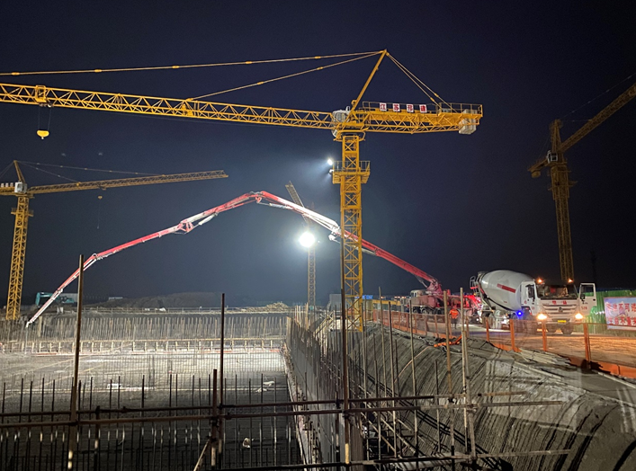 本次澆筑底板的AAO生化池池體規(guī)模大,澆筑難度系數(shù)高。為確保澆筑工作順利進行,澆筑前參建各方多次召開施工專題會議。針對此次混凝土的澆筑方法、澆筑注意事項、混凝土強度及配合比要求等編制了詳細的施工方案,并對施工過程中可能出現(xiàn)的問題制定了應急預案。澆筑期間,管理人員實行“兩班倒”,全程監(jiān)督旁站,嚴控澆筑質量。最終,全體人員克服了場地受限、夜間施工道路濕滑等重重困難,保安全優(yōu)質量,AAO生化池一號片區(qū)混凝土底板澆筑工作按既定工期順利完成。