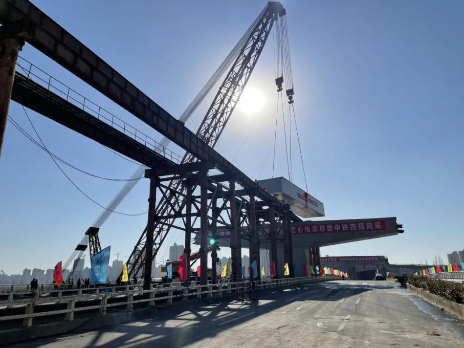 跨古運河鋼箱梁橋施工是項目的重難點。為了確保此次吊裝順利完成,項目部成功解決了35KV高壓遷改、老橋下部結(jié)構(gòu)施工空間受限、橋位西側(cè)揚州閘導(dǎo)流墩對吊裝設(shè)備站影響、老橋上不能搭設(shè)臨時支架、鋼梁兩側(cè)混凝土箱梁同時施工等多重困難,對現(xiàn)場施工人員進(jìn)行安全技術(shù)交底,及時清除承臺冰雪,做好冬季防護(hù)措施。