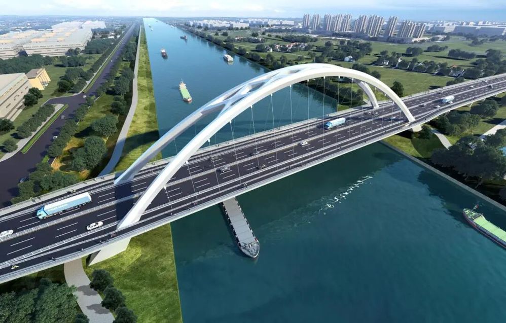除了核心的道路建設,主要建設內容還包含紅線范圍內道路、橋梁、排水、交安、照明、環(huán)保、綠化及相關附屬設施等。其中,新建的上跨京杭大運河大橋為項目核心部分,總長度約742m,主跨采用跨徑200m提籃拱橋設計,既保證通行功能,又具備一定景觀價值。工程計劃總投資約4.09億元,建設工期約30個月。